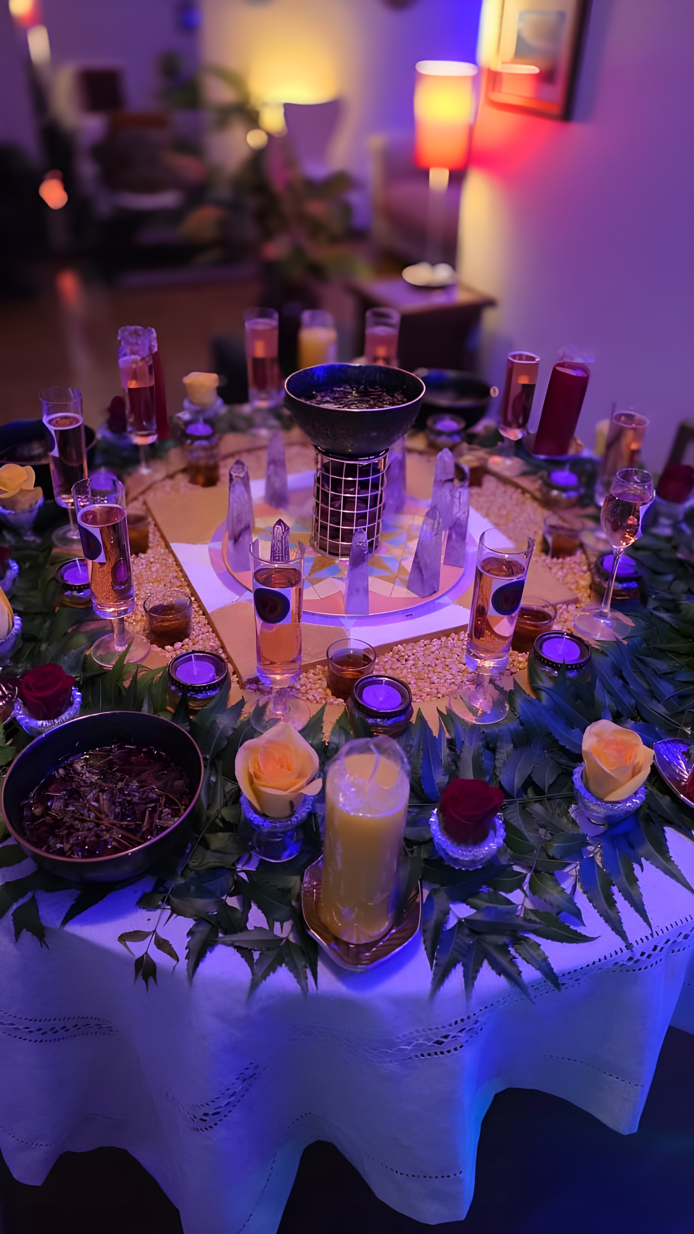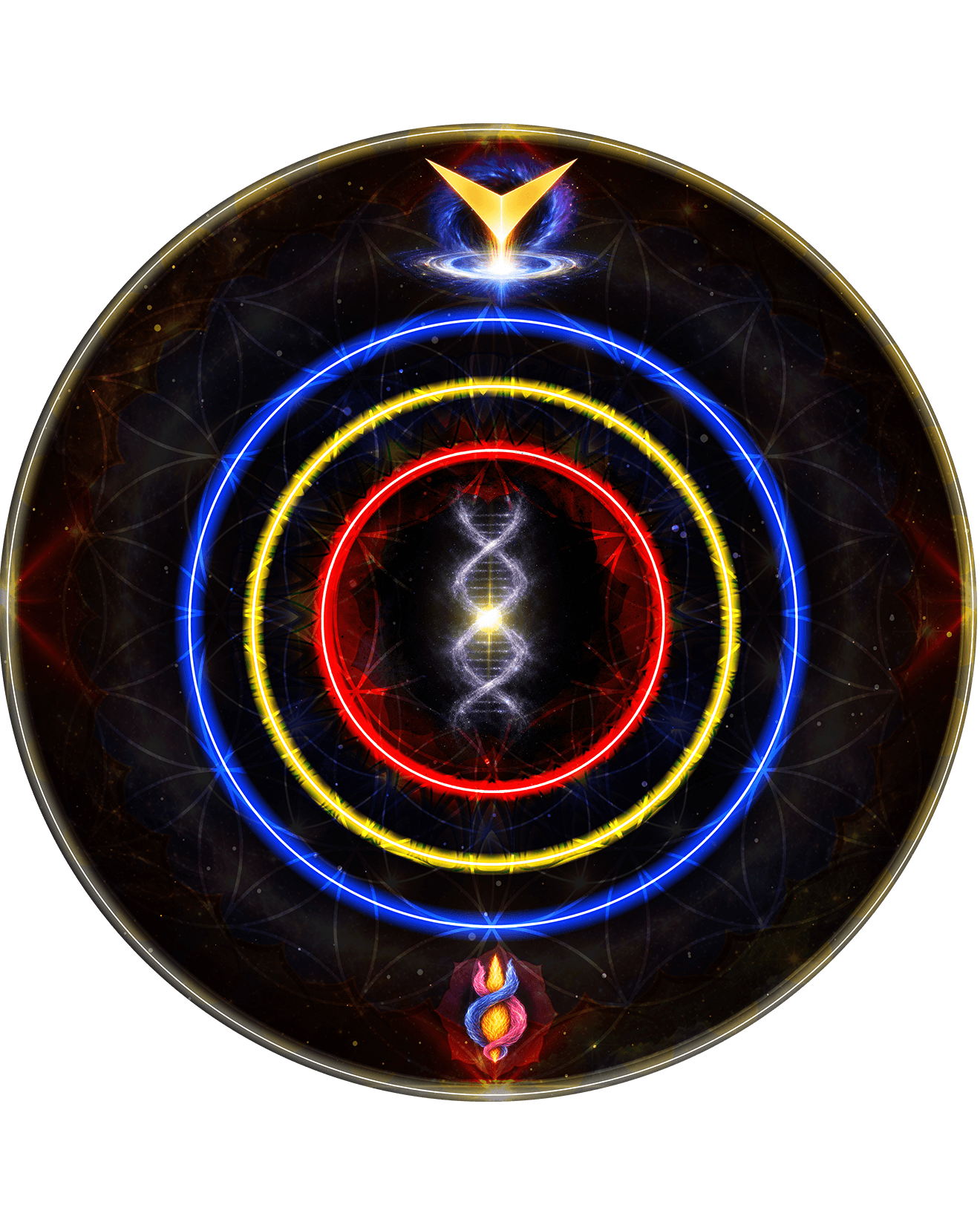 Ao criar cada mandala, ela acessa a linguagem primordial da Geometria Sagrada, dispondo formas e símbolos que se entrelaçam em uma harmonia capaz de gerar um substrato energético real.